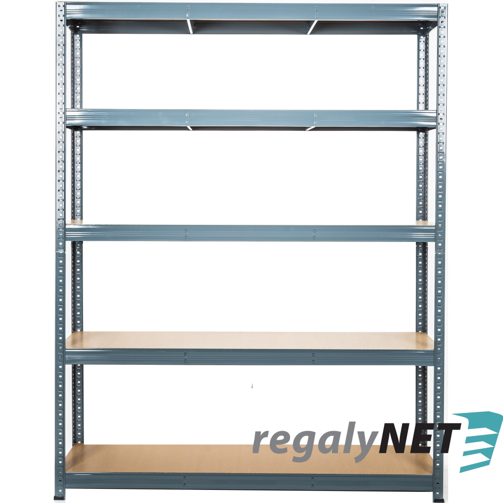 Regal 5-policový s lakovanou kovovou konštrukciou , policami z DTD s nosnosťou jednej police 300 kg.